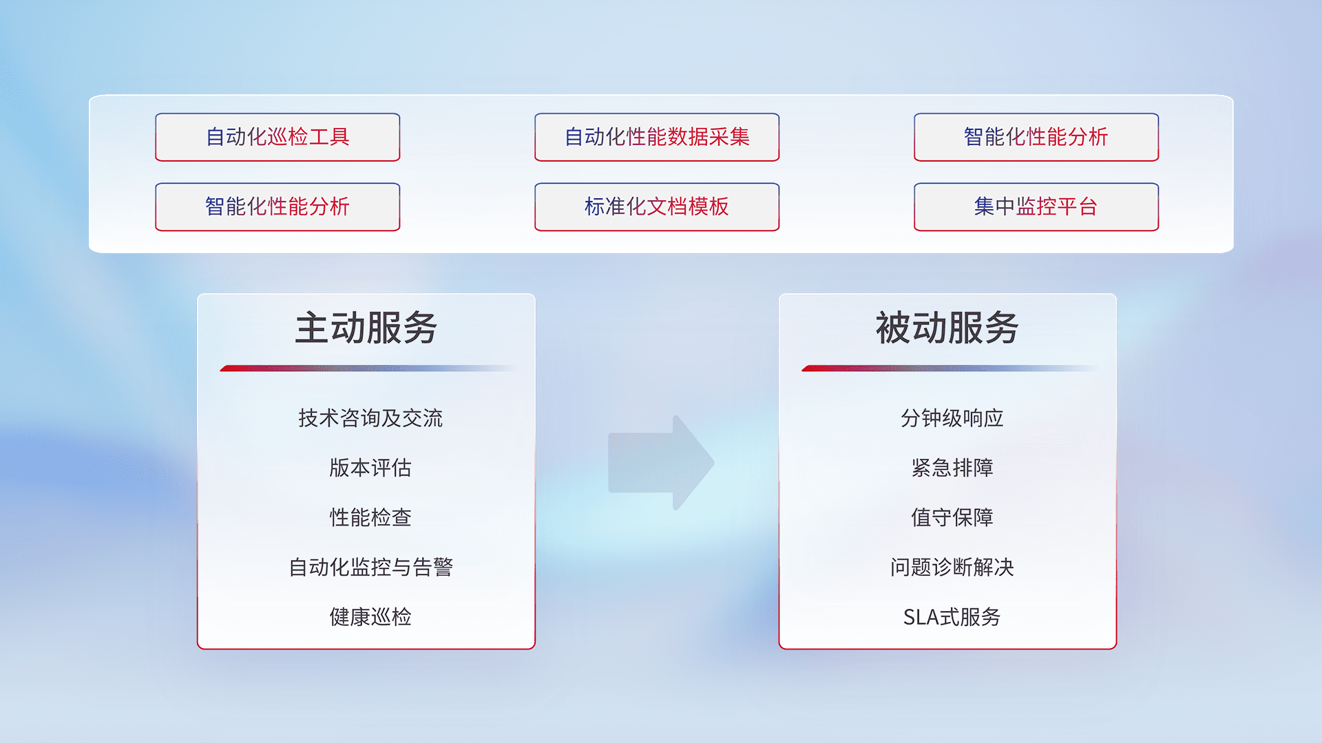 智能化工具和标准化文档,,,,保障服务质量,,,提供主动服务(包含技术咨询、、、版本评估、、、、性能检查、、、、自动化监控与告警、、健康巡检)和被动服务包含(分钟级响应、、、、紧急排障、、、值守保障、、问题诊断解决、、SLA服务)。。。。