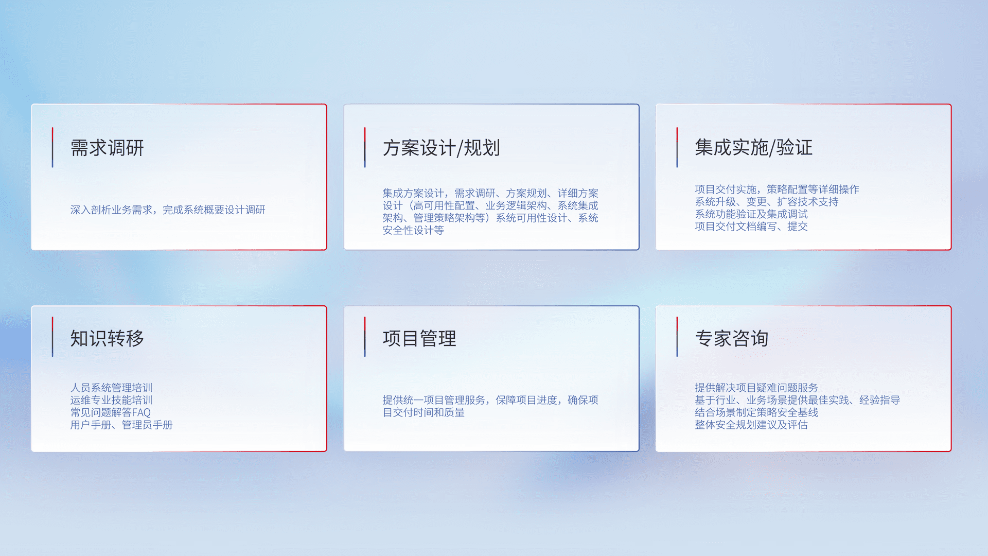 针对客户行业特性,,,,将宏观的安全战略和需求,,,通过专业的交付服务,,,实现项目落地,,,,为客户提供标准规范的集成交付服务。。。